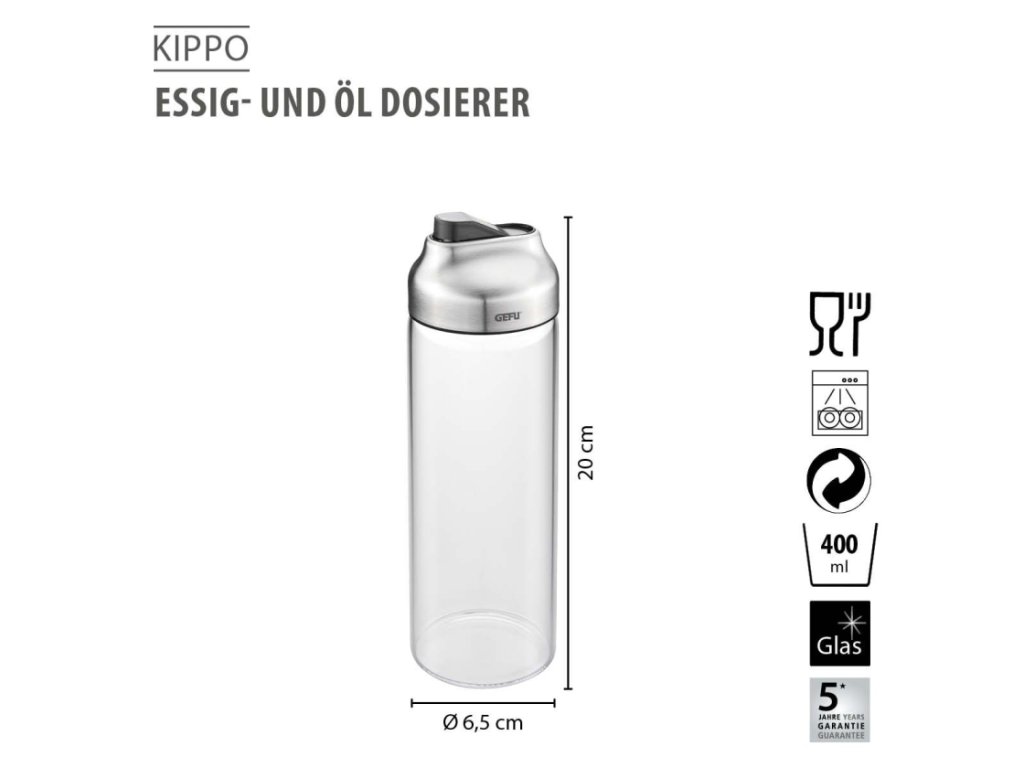 Jakmile se KIPPO použije k dávkování, chytré kývavé víko se otevře a obsah lze kontrolovaně dávkovat. Neodkapávací výpust zaručuje čisté a přesné dávkování při zjemňování křupavých salátů nebo smažení křupavých pochoutek. Díky KIPPO si vždy můžete nalít přesně tolik tekutiny, kolik chcete – praktické a stylové do kuchyně i ke stolu.