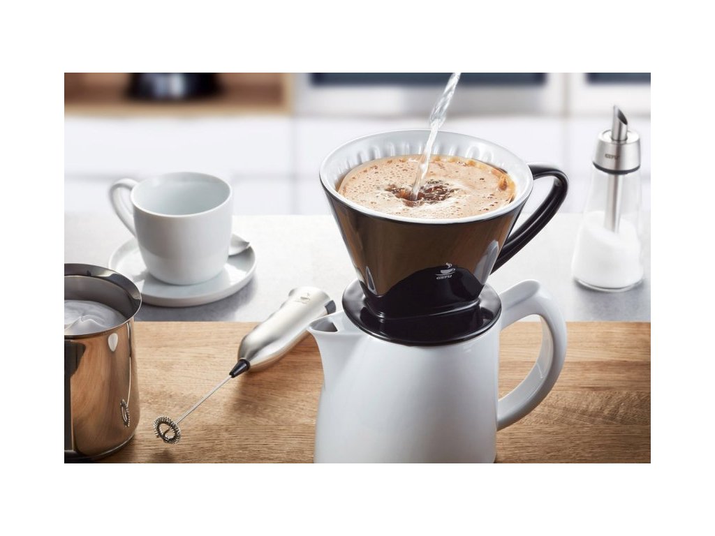 S filtrem na kávu STEFANO od Gefu je vaření kávy také vizuálním potěšením. Kávovou sedlinu jednoduše zalijte trochou vody, aby nabobtnala a chutě se rozpustily. Poté naplňte filtr až po okraj a počkejte, až káva úplně protéká. Tento postup opakujte, dokud není šálek nebo džbán plný, a pak ... užívejte si!