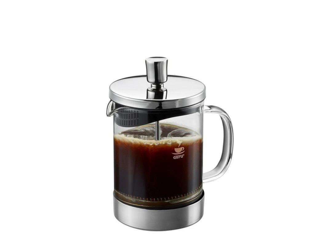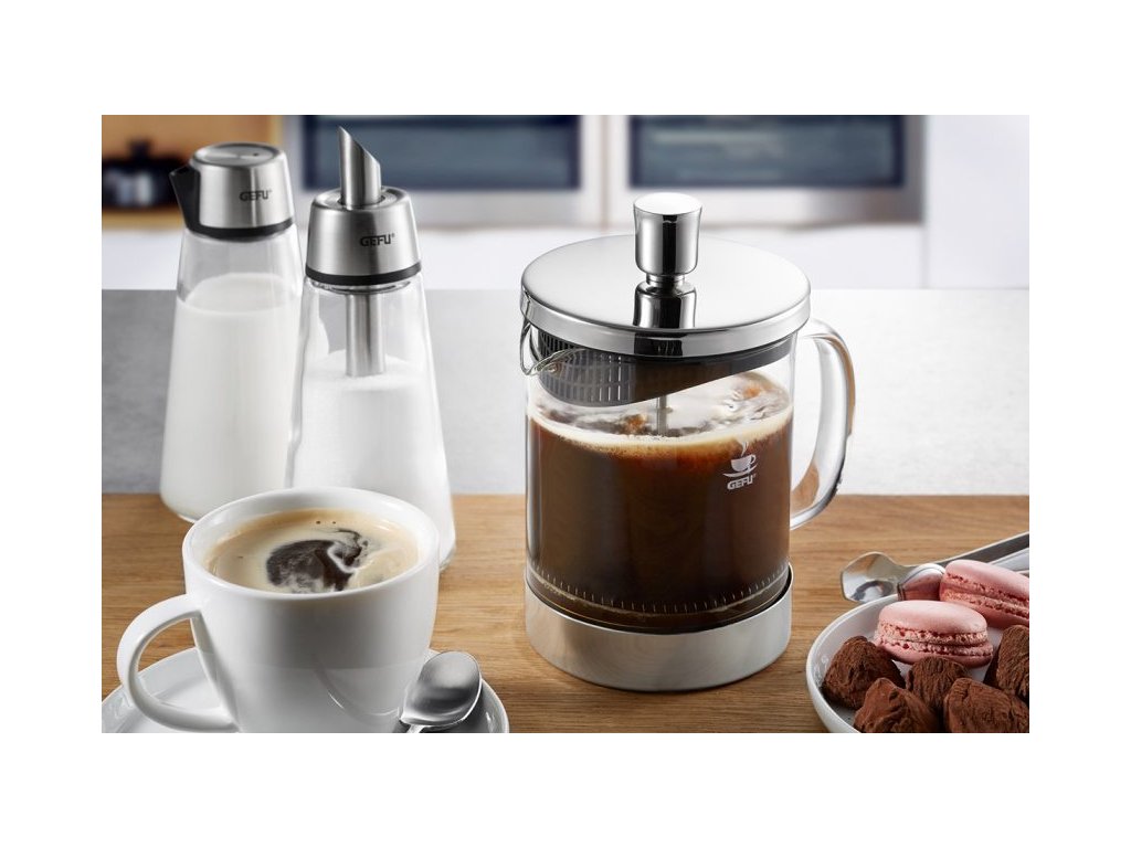 Je to tak jednoduché: vložte hrubě mletý kávový prášek do žáruvzdorného kávovaru, nalijte horkou vodu a nechte kávu vařit. Poté znovu krátce promíchejte, nasaďte víko a pomalu stlačte kovový filtr. Čistý požitek z kávy, protože kávová sedlina zůstane v nádobě. Stylový podstavec z nerezové oceli lze snadno sejmout pro snadné čištění. Čaj lze také perfektně připravit v tomto french pressu!