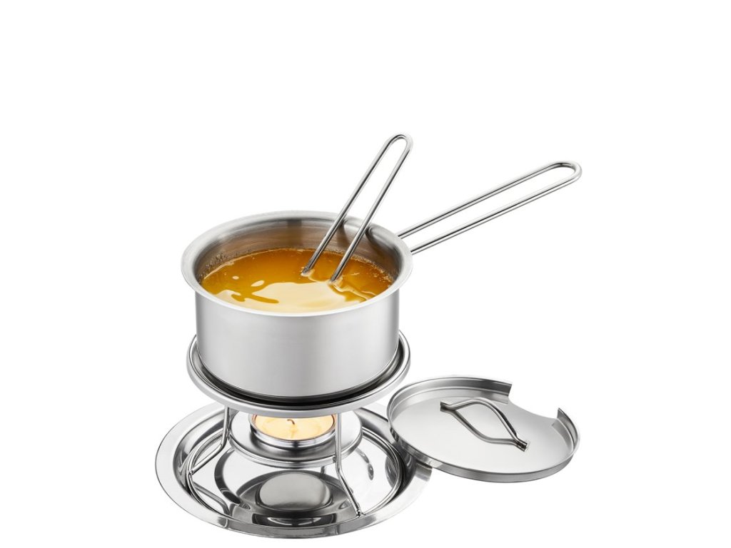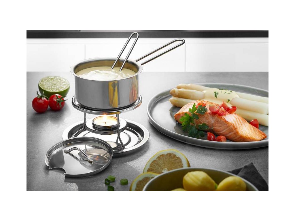 Od čerstvě rozpuštěného chřestového másla a voňavé omáčky z červeného vína až po sladké dobroty, jako jsou horké třešně nebo čokoládová omáčka: všestranná nerezová sada spolehlivě udrží jídlo teplé.
