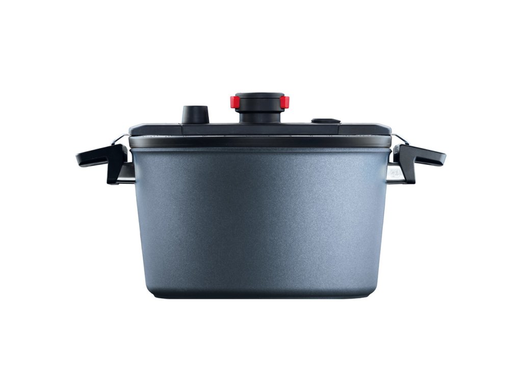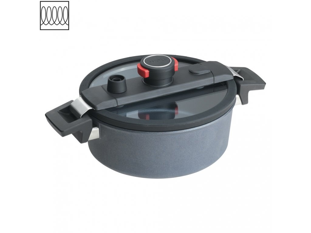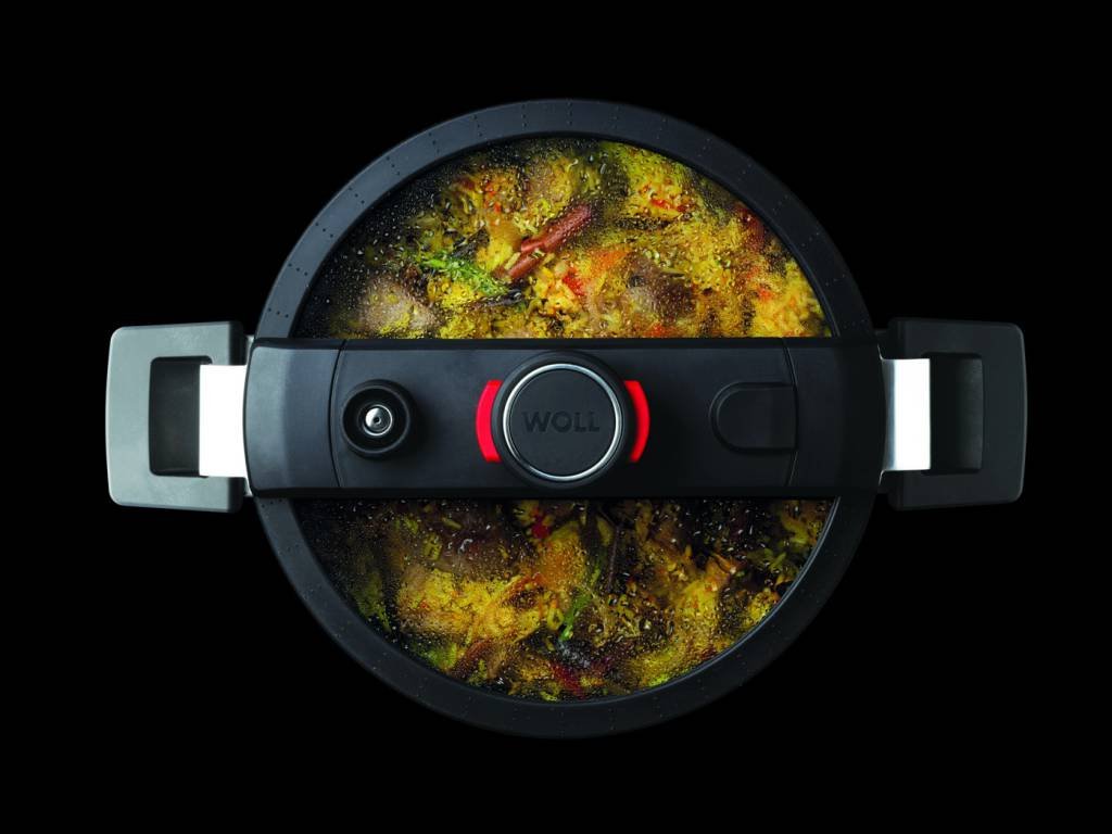 - Revoluce při vaření, kdy se vaří za mírně zvýšeného tlaku. To je polo-tlakový hrnec, který kombinuje nepřilnavou, unikátní technologie povrchů s patentovanou poklicí Woll, která je uzpůsobená pro vaření při mírně zvýšeném tlaku.