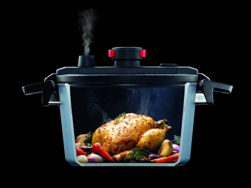- Přípravu dušeného masa s tímto polotlakovým hrncem zkrátíte až o polovinu a ušetříte téměř 50% energie. Pokud budete chtít přidat během vaření suroviny, nemusíte přes ventil upouštět páru, ale vše za vás vyřeší intuitivní systém stisknutím jednou rukou.