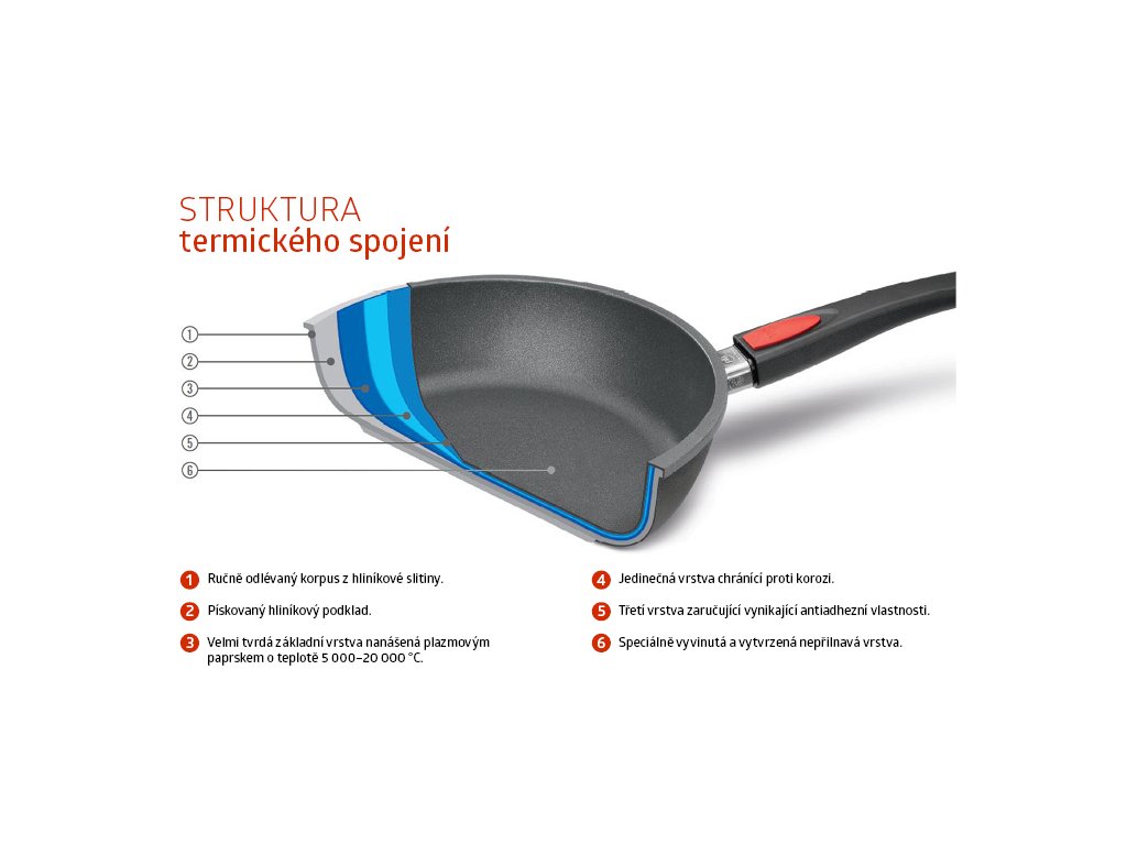- Tělo pánve je z tvrzené hliníkové slitiny, díky které rychle akumuluje a distribuje teplo po celém povrchu pánve